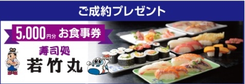 な、な、なんと!!!ご成約いただいたお客様には、「寿司処 若竹丸」の5,000円分お食事券ももれなくプレゼント💕