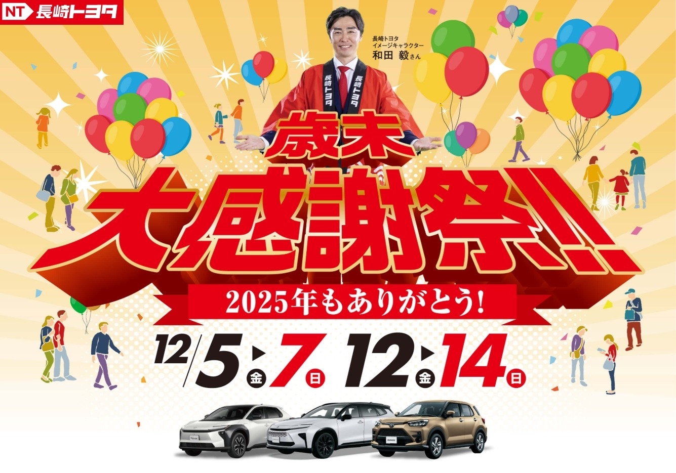 歳末大感謝祭!! 2025.12.04 長崎トヨタ時津店 長崎トヨタ こんにちは長崎トヨタ時津店です😊 12/5(金)→12/7(日) 12/12(金)→12/14(日) 歳末大感謝祭!! はじまりまーす!👏👏👏 大感謝の6日間✨ bZ4Xの試乗車のご用意もございます! 気になるお車ございましたら お気軽に時津店まで🚙 ご来店お待ちしております😊 ☎095-881-3500 長崎トヨタ 時津店 前の記事へ 店舗ブログ一覧に戻る 次の記事へ